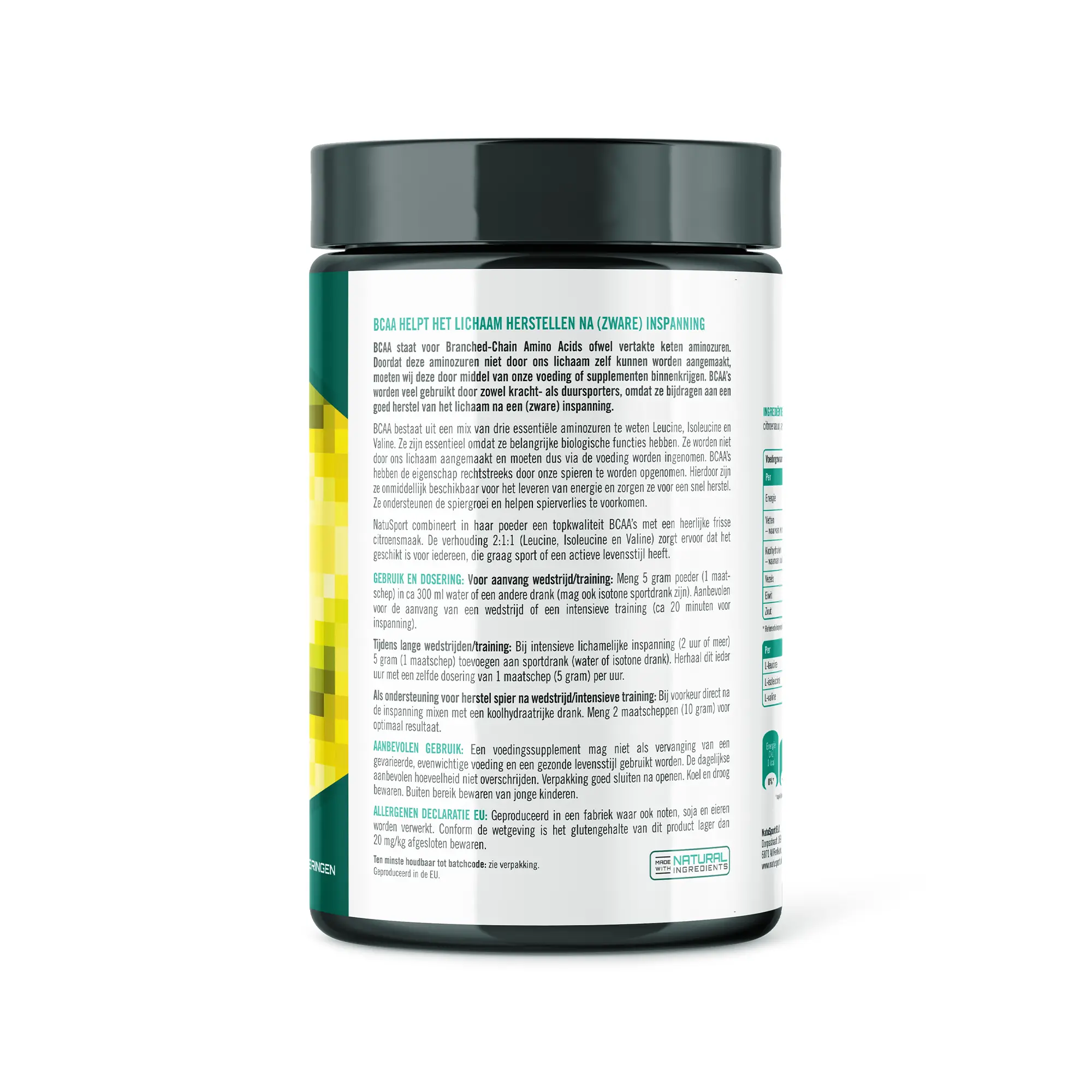 Natusport BCAA Poeder Lemon/Citrus bevat de drie essentiële aminozuren leucine, isoleucine en valine. Deze aminozuren worden ook wel Branched-Chain Amino Acids genoemd, oftewel vertakte keten aminozuren. Omdat je lichaam deze niet zelf kan aanmaken, moeten ze via voeding of supplementen worden ingenomen.